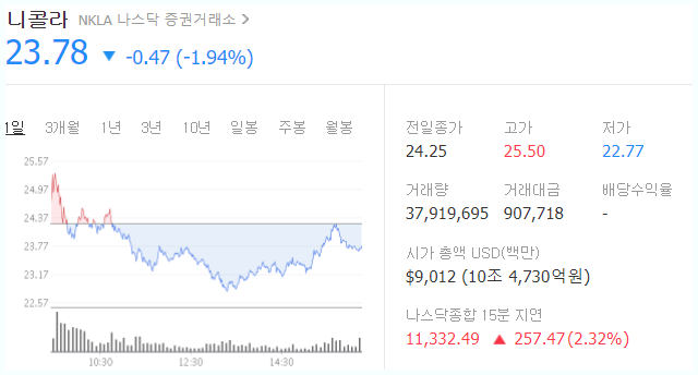 미국 수소 트럭업체 니콜라의 주가를 한화가 어느정도 보유하고 있는데요 지분3.07% 보유하고 있습니다 적지않은 수치로 한화솔루션은 니콜라의 롤로코스터의 영향을 받고있습니다 최근 니콜라는 사기의혹에도 휘말리며 주가가 하락하기 시작했습니다
