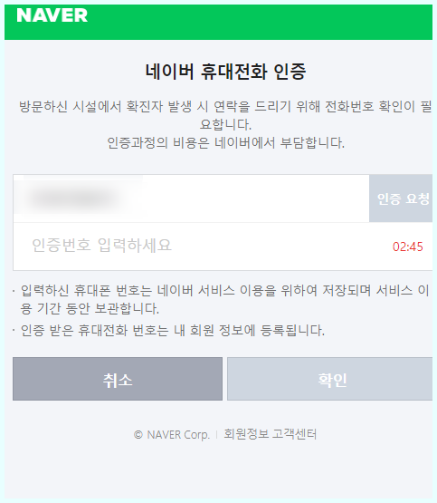그 다음 본인이 사용하고 있는 휴대폰 번호가 뜨면서 인증요청 버튼을 눌러주시면 인증요청 화면으로 넘어갑니다 시간안에 꼭 인증번호를 입력해주세요 인증번호를 넣고 확인을 눌러주시면