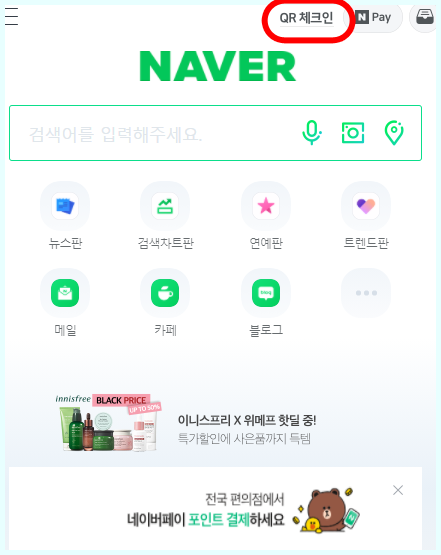 네이버 또는 네이버를 어플을 사용하시는 분들이라면 QR코드를 쉽게 만들수 있습니다 우선 네이버 메인화면에서 qr체크인을 클릭하시거나 또는 로그인상태라면 자신의 프로필을 눌러주세요