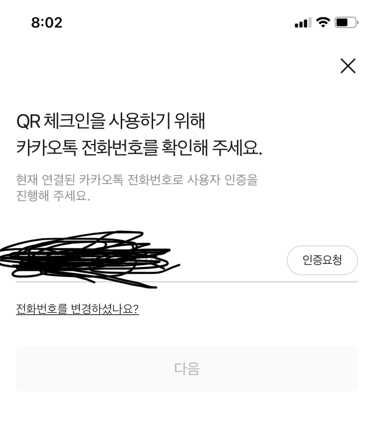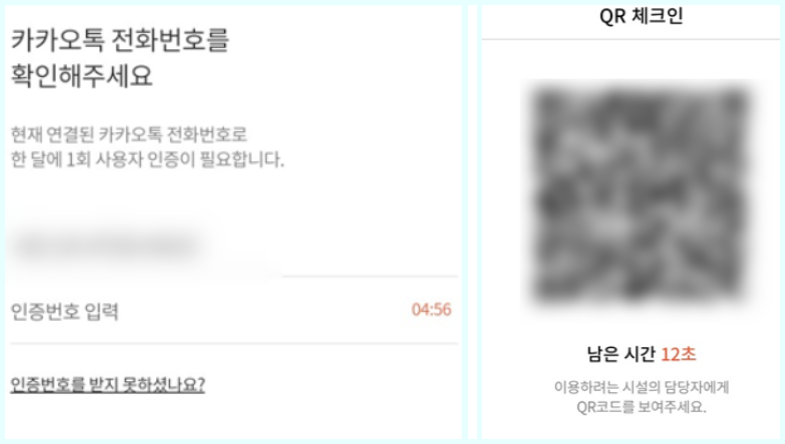 버튼을 클릭하면 다음화면으로 넘어갑니다 QR체크인이 뜨면서 집합시설 출입을 위한 체크인을 시작한다고 하며 동의를 요구 합니다 동의해주세요 다음화면으로는 카카오톡 전화번호 인증이 필요합니다 자신의 전화번호를 넣고 인증요청을해서 전화번호 인증을 해주세요