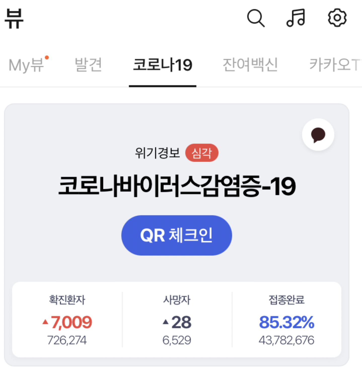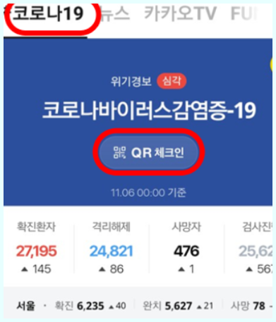 #을 누르시게 되면 코로나 19를 눌러주세요 상단에 있는 메뉴입니다 파란색 화면이 뜨면서 현재 코로나 확진확자와 격리해제자등의 숫자가보이면서 QR체크인이 보이실겁니다 빨간색 부분으로 표시된 부분이 QR 체크인 버튼입니다