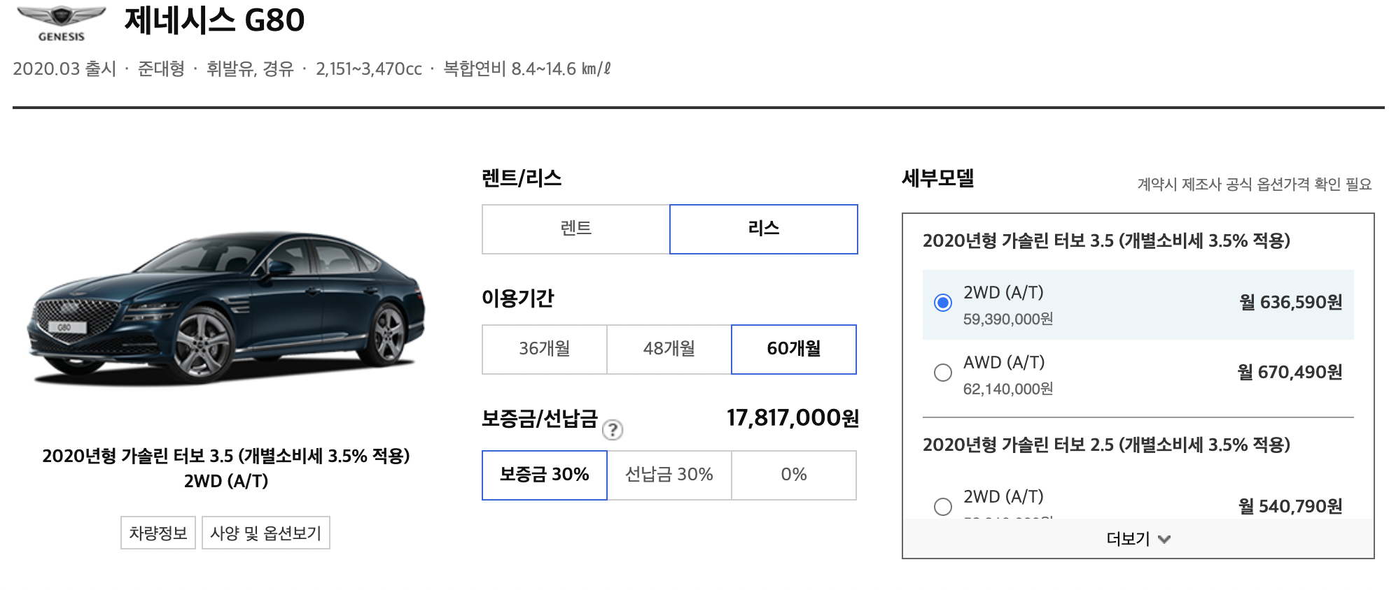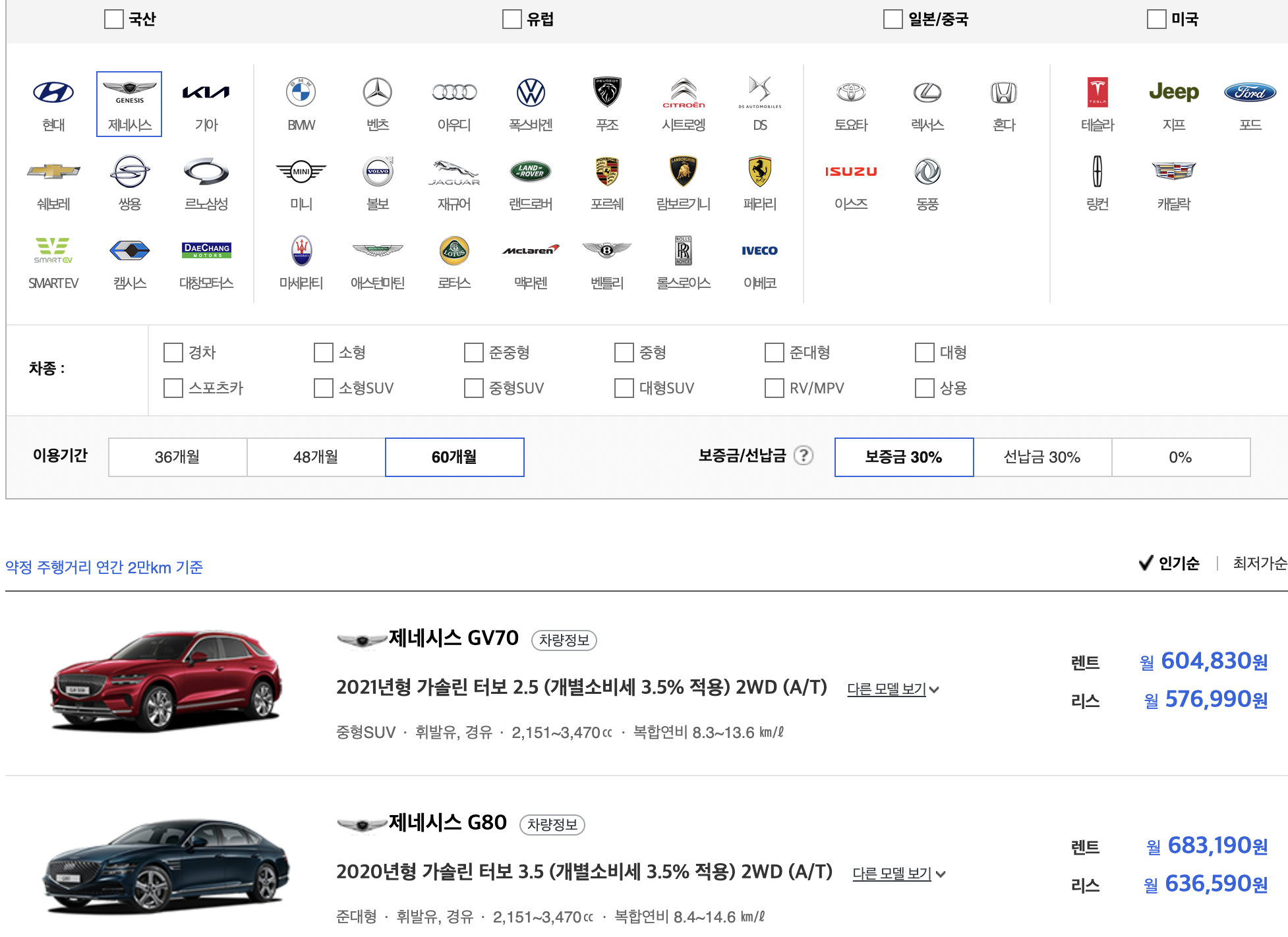 국산차 리스뿐 아니라 수입차 해외차 리스차량도 선택해서 볼수 있습니다 우선 가장 많이 타는 제네시스 리스 차량 가격부터 알아보도록 하겠습니다 제네시스 G80 기준으로 검색해서 보여드리겠습니다