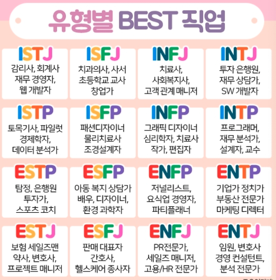 MBTI 성격유형검사 무료 방법을 찾는 분들이 많은데요 이유중 하나는 꾸준하게 방송에서 MBTI 유형과 성격에 대한 분석과 관련된 이야기들이 많이 나오기 때문입니다 그래서 준비한 MBTI 성격유형검사 무료 검사 방법과 MBTI 성격유형별 연봉 정보까지 있으니 직장생활을 하시는 분들이라면 더 도움이 될것 입니다 자세한 MBTI 성격유형검사 무료 아래에서 확인하세요