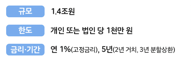 소상공인 희망대출 융자 규모는 1.4조원으로 책정되어 있습니다 한도는 개인 또는 법인당 1천만원으로 정해져 있으며 금리는 연1%[고정금리] 5년입니다 자세한 희망대출 융자와 규모는 표를 확인하세요