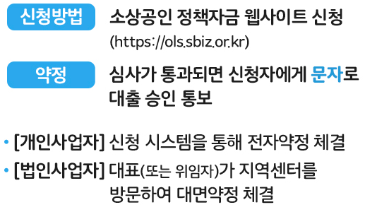 위에 알려드린 저신용자 소상공인 정책자금 웹사이트로 가셔서 신청하셔야 합니다 개인사업자는 신청 시스템을 통해서 전자약정을 체결해야 하며 법인사업자는 대표 도는 위임자가 지역센터를 방문해서 대면약정을 체결해야 합니다 신청후 심사가 통과될시 신청자에게 문자로 대출 승인이 통보가 갑니다.