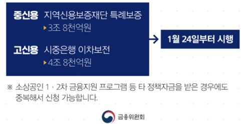 희망대출 플러스는 세가지로 분류되어 신청 접수가 진행됩니다 그중 중신용과 고신용에 대해서 말씀드리겠습니다 중신용은 지역 신용보증재단 특례보증으로 신청해야 하며 책정 금액은 3조 8천억원 입니다 1월 24일부터 접수 할수 있습니다