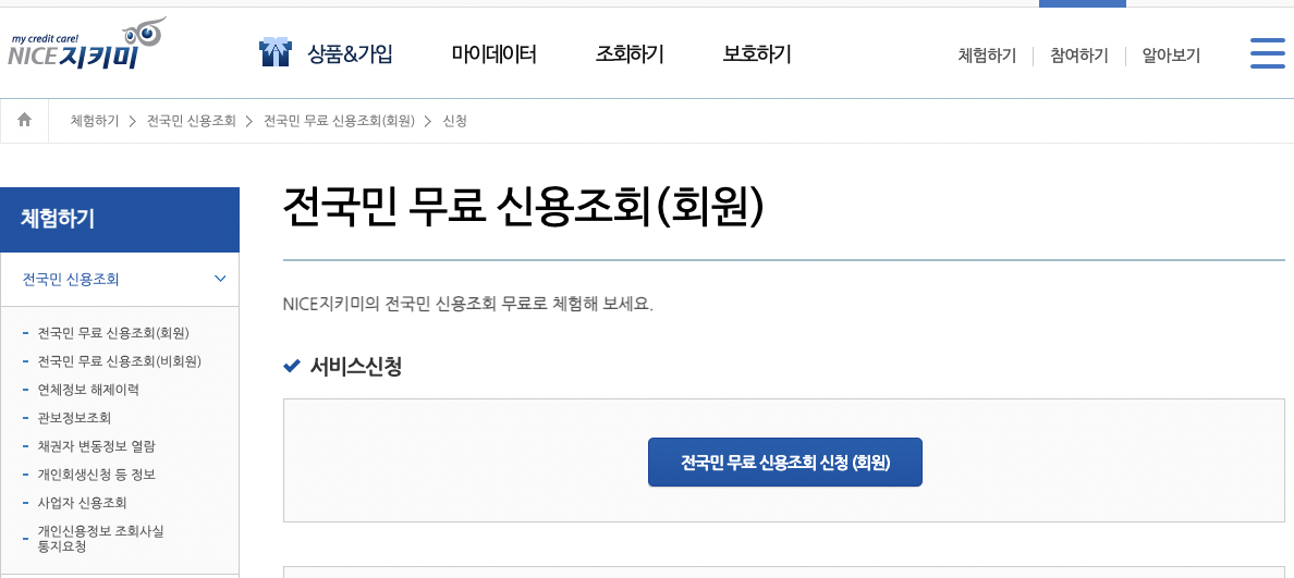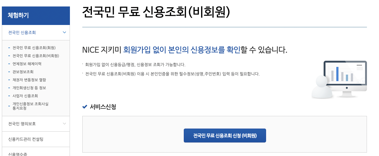 나이스 지키미 사이트를 접속하셔서 신용점수를 조회하시면 됩니다 서비스는 전국민 신용조회 서비스를 이용하시면 됩니다 회원가입과 비회원조회가 있으니 편하신 방법으로 자신의 신용점수를 확인하시면 됩니다 지키미 사이트 바로가기는 아래에 있습니다