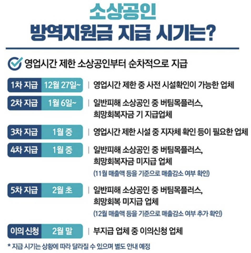 5차 지급 - 2월 초 ~ [일반피해 소상공인 중 버팀목플러스, 희망회복자금 미지급 업체 / 12월 매출액 등을 기준으로 매출 감소 여부 확인]