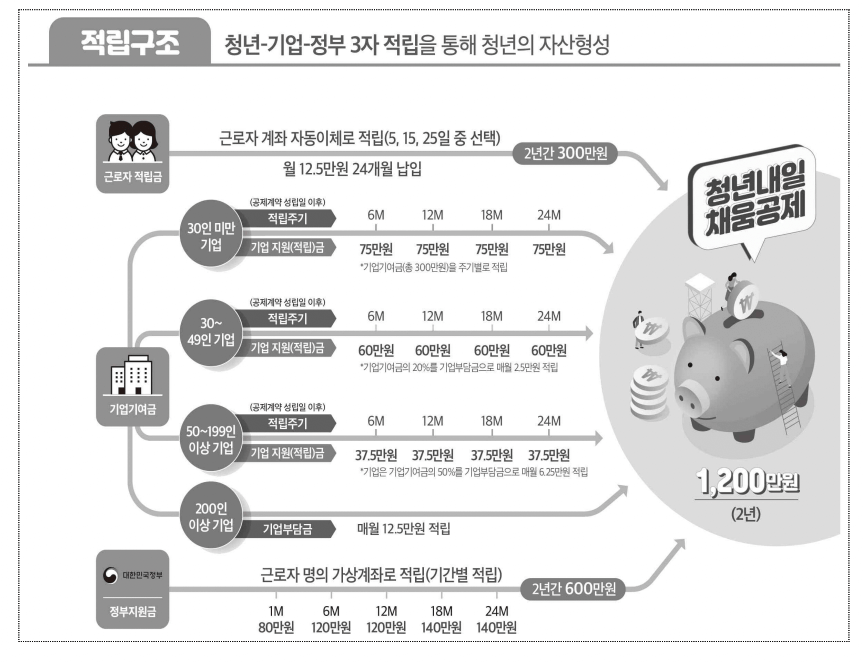 - (정부→청년) 취업지원금 2년간 600만원 적립 (1・6・12・18・24개월 등 2년간 5회, 청년가상계좌에 적립) → 중소기업 취업 청년이 정규직으로 2년간 근속시 1,200만원 목돈 마련