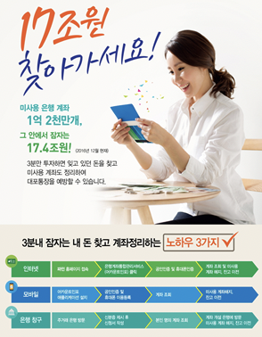 정부에서는 17년도부터 17조원을 찾아가라는 제목으로 미사용 은행 계좌 정리 캠페인을 진행했습니다