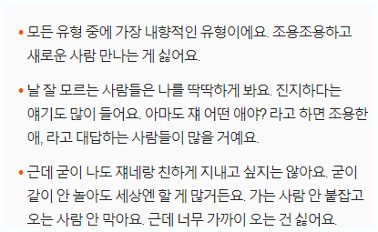 모든 유형중 가장 내향적인 유형이라고 합니다 슬프게도;; 조용조용하며 새로운 사람 만나는게 싫어요 라고하는데 맞는것 같네요 사람사귀기 어려워하는 성격입니다