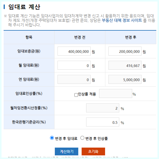 변경후 임대료을 선택해야 새로적용되는 인상률로 계산됩니다 그후 임대보증금 월임대료등 자신에게 있는 정보들을 입력후 계산하기를 눌러주시면 계산이 되어 나옵니다 인상률적용은 해제해줘야 합니다 작은 %차이에도 많은 차이가 있습니다