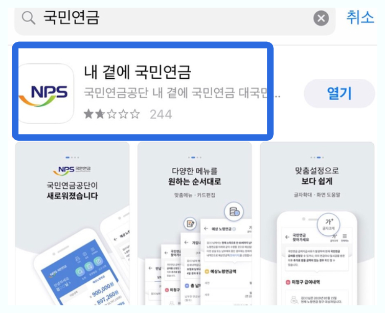 국민연금 예상수령액 모바일에서 조회하는 방법은 우선 앱스토러오 접속을 하셔야 합니다 국민연금을 조회하셔서 내곁에 국민연금 어플을 다운받으세요