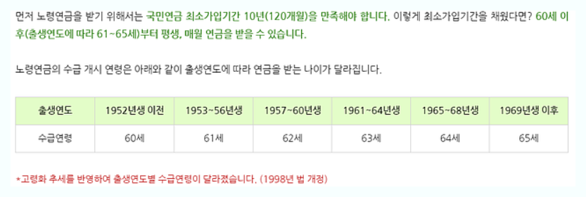 69년도 이후부터는 만 65세 기준이 적용이 됩니다 올해를 기준으로 들어볼까요 올해의 국민연급 수령이 가능한나이는 만62세인 58년생 입니다