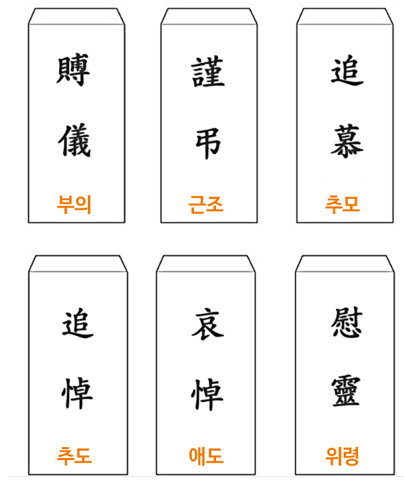 봉투는 총 6가지로 사용할수 있습니다 한문으로 적어야 한다는 조건을 꼭 없지만 한자를 적어서 고인에 대한 존중의 의미와 예를 갖춘다고 볼수 있습니다