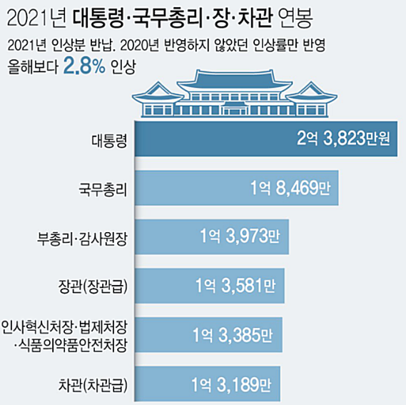 2021년 기준 대통령의 월급은 2억 3823만원 입니다 지금은 2022년 기준으로 더욱더 올랐을것 같습니다 대통령이 많은 월급 연봉을 받는다고는 알고 있었지만 생각보다 많은 금액을 받는다는 생각을 하게되네요
