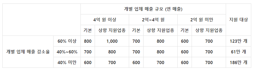 -해당업체 속해있는 업종 전체의 매출 감소 40% 이상 [상향지원업종]