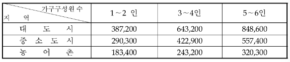 대도시,중소도시,농어촌 지역에 따라서 가구 구성원의 인원에 따라 한도액이 상이합니다