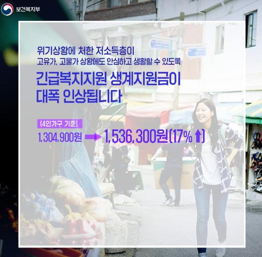 긴급복지 생계지원금은 생계곤란과 같은 위기상황에 있는 도움이 필요한 저소득층 과 생계 및 주거를 같이 하고 있는 가족 구성원들에게 긴급복지 지원법에 따라서 일시적으로 지원하는 제도입니다 발표한 인상률을 보면 4인가구 기준으로 1,536,300원 까지 지원이 인상되었으며 인상폭은 17% 가량 이라고 합니다