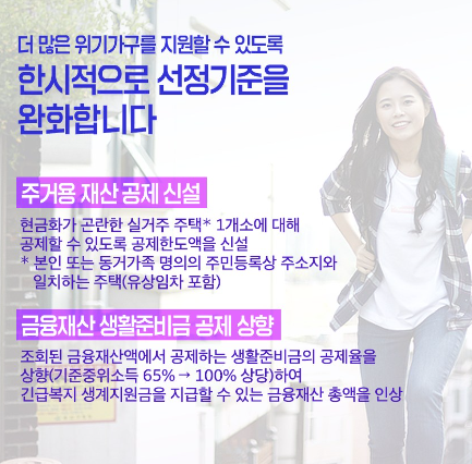 한시적으로 재산기준을 완화하여 시행중입니다[ 소득 기준은 중위소득 75% 이하 입니다]