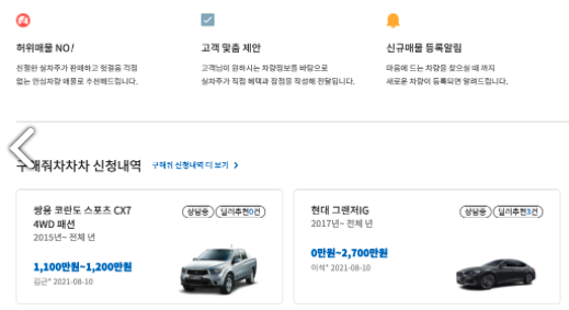 원하는 정보를 선택후 고객의 성향 원하는 목적을 분석해서 차량을 보여주게 됩니다 메인화면에서 많은 정보를 한눈에 확인할수 있습니다
