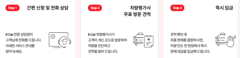 간편 신청을 통해서 전화상담을 받은후 서비스 안내를 받을수 있으며 차량평가사가 무료방문 견적을 통해서 고객의 차량이 있는 곳에 K카 평가사가 방문해서 견적을 알려줍니다 견적 확인후 최종적으로 판매를 결정한다면 차량 인도 전 현장에서 즉시 판매 대금을 입금해줍니다 전과정이 K카 답게 수수료가 없습니다 K카에서 직접 구매 판매를 하기 때문입니다