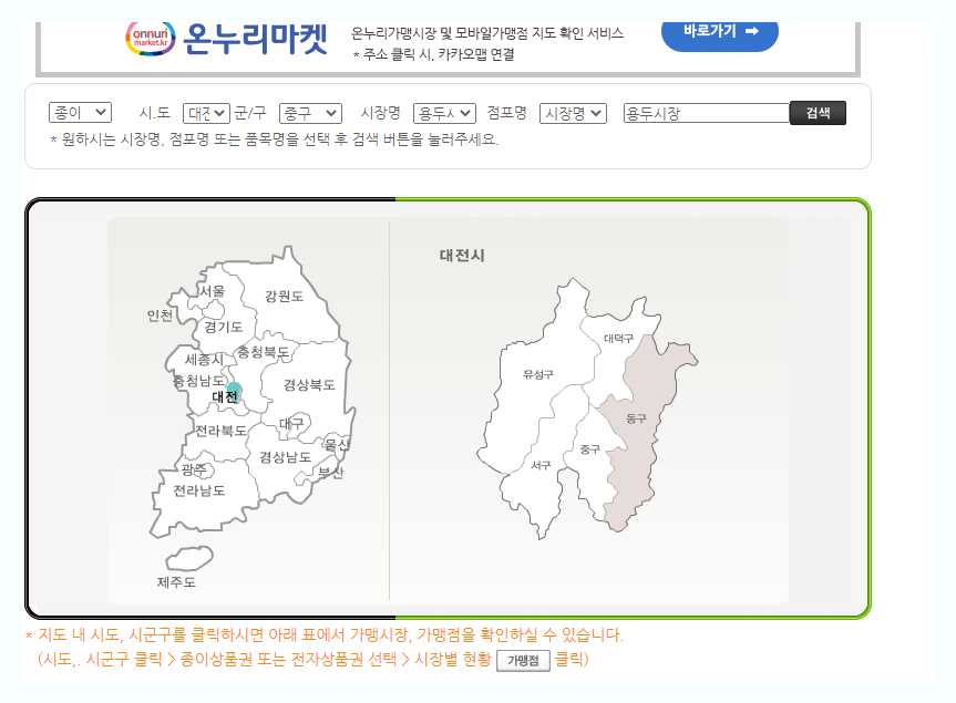 사진을 보시게되면 지역을 가맹점 지점을 찾기위해서는 검색을 해야합니다 보다시피 그림으로도 또는 특정지역을 검색해서 찾을수 있습니다 대부분 시장들이 나옵니다 온누리상품권 특성상 시장에서 쓸수있는 가맹점이 몰려있는건 당연합니다 전통시장 통통 주소는 아래를 확인하세요