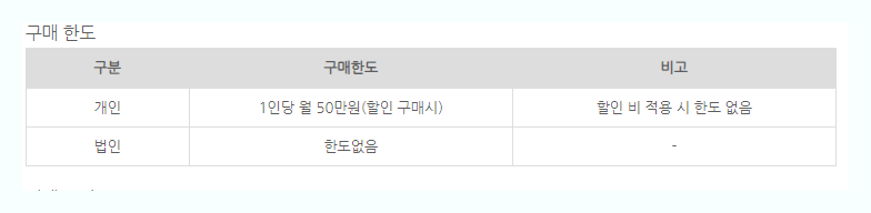 또한 1인당 월 50만원 할인구매가 가능합니다 비할인은 한도없이 구매할수 있다고 하지만 실제로는 할인을 받아야 구매하기 때문에 월 50만원을 초과해서 구매하시는 개인을 없으실것 같네요